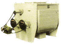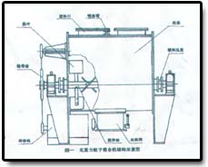 本機為臥式筒體,雙軸多槳結構混合機體焊制成型.頂部裝有噴霧加液裝置,物料理自頂部加入,混合后由底部出料。