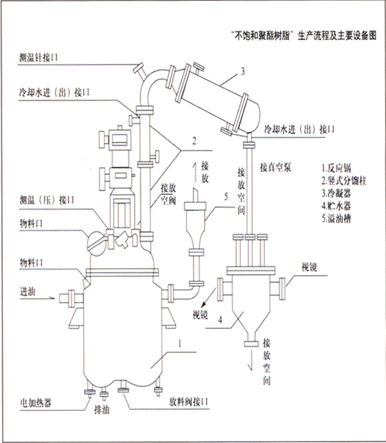 本全套裝置是用于生產不飽和聚脂樹脂、酚醛樹脂、環氧樹脂、ABS樹脂、油漆的關鍵設備。全套設備由反應鍋、豎式分餾柱、臥式冷凝器、貯水器、溢油槽、管線(對稀釜)等組成,全套設備與物料接觸部分的采用不銹鋼制作。 |